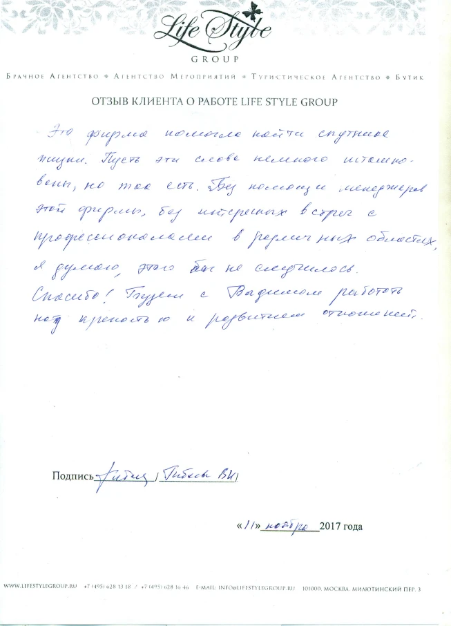 Life Style Group – современная компания свадебной индустрии, отличающаяся от существующих служб знакомств и брачных агентств, собственными эффективными методиками и технологиями, созданными на основе российского и международного опыта в области семейной психологии и коучинга, детальным анализом запросов каждого Клиента и современного рынка услуг, регулярным контролем качества и динамичностью, а также строгой приверженностью к высокими стандартам сервиса, которые позволяют нам быть впереди и превосходить ожидания Клиентов!